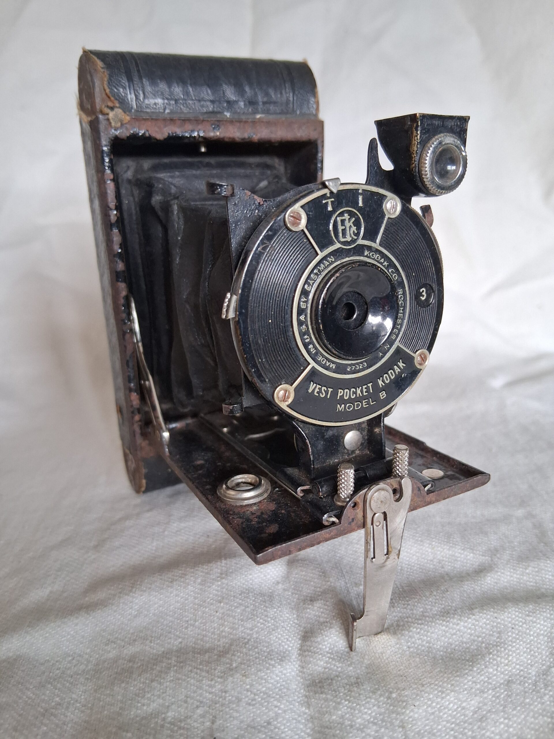 Petit appareil pliant (vest pocket = poche de gilet) d'une compacité révolutionnaire pour l'époque. Contrairement aux premiers modèles "Autographic" au fini noir lisse, le Model B se reconnaît à son corps en métal recouvert d'un grainage noir (iridescent ou mat) et à son ouverture simplifiée.