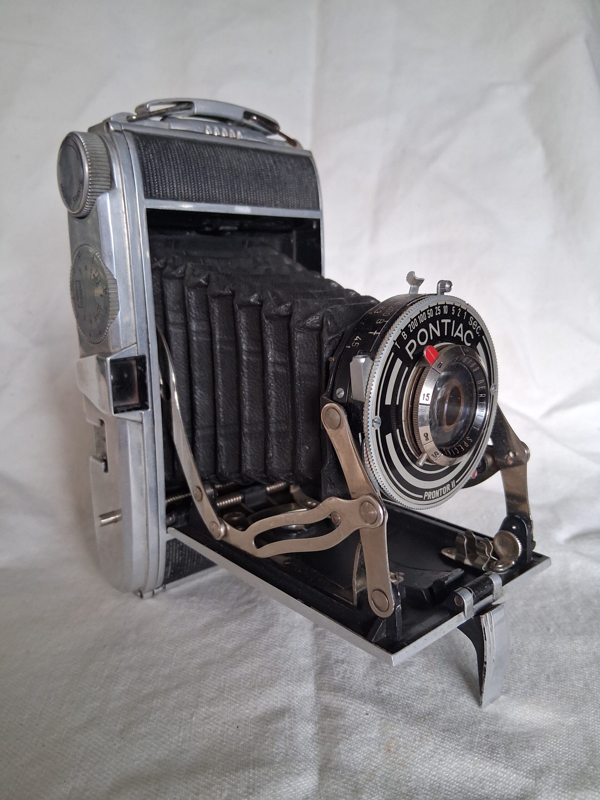 Appareil photographique pliant (folding) de fabrication 100% française. Contrairement aux appareils de l'époque dont le corps était en tôle emboutie, le Pontiac est célèbre pour son boîtier réalisé en fonte d'aluminium moulée sous pression d'un seul bloc (d'où son nom). Cela lui confère une rigidité exceptionnelle et un poids rassurant.